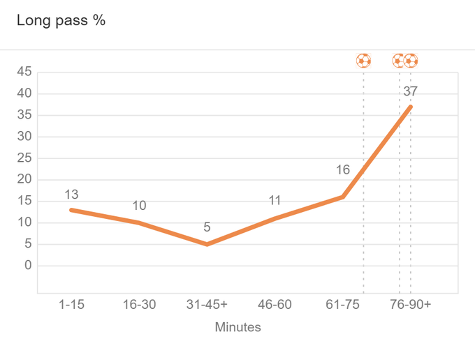 Вищесказане підтверджується статистикою. Відсоток довгих передач «Шахтаря» у останні 15 хвилин поєдинку зріс в рази, дійшовши до якоїсь дивовижної цифри у 37%! І це при тому, що в середньому в поточному розіграші УПЛ «гірники» мають на своєму рахунку мінімальний показник щодо довгих передач серед усіх команд-учасниць – лише 778 (в «Олександрії», наприклад, він дорівнює 1019).