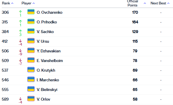 Невеликий прогрес і у Віталія Сачка: +3 місця і 384-та позиція. Вадим Урсу, Юрій Джавакян, Ерік Ваншельбойм і Владислав Орлов втратили кілька рядків. Олексій Крутих, Ілля Марченко та В'ячеслав Бєлінський зберегли свої місця.