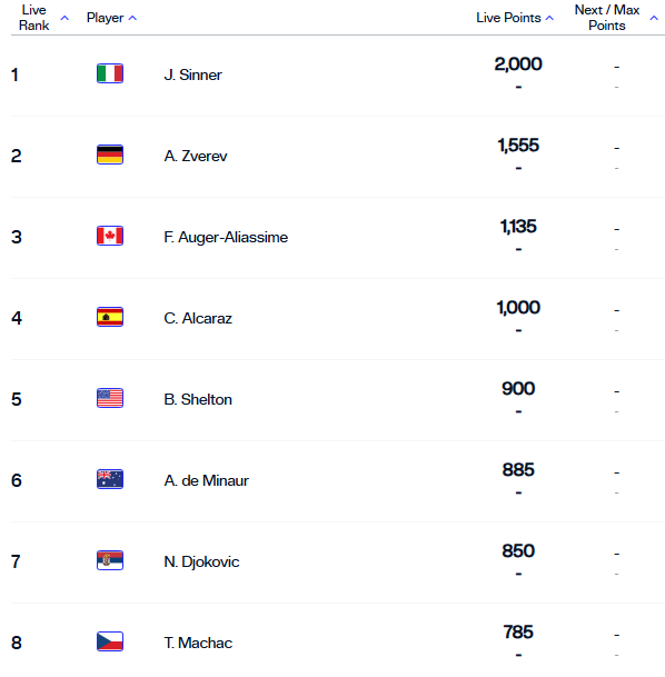 Сіннер у сезоні завдяки титулу на Aus Open набрав найбільше очок і йде першим у гонці. У топ-3 також Звєрєв і Оже-Альяссім.