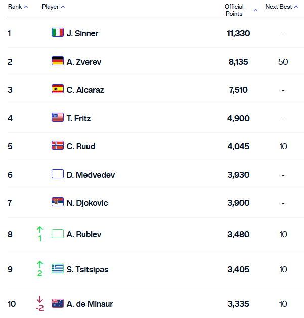 Яннік Сіннер продовжує посідати перше місце, Александр Звєрєв – другий, Карлос Алькарас – третій.
