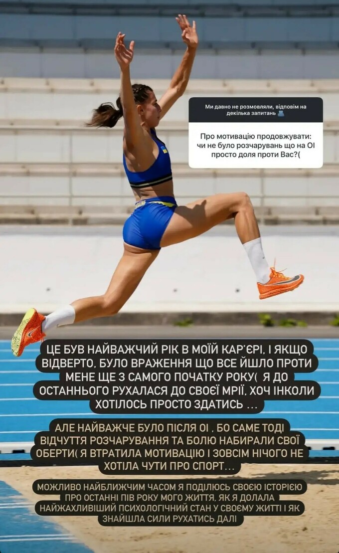 «Це був найважчий рік в моїй кар'єрі, і якщо відверто, було враження, що все йшло проти мене ще з самого початку року. Я до останнього рухалася до своєї мрії, хоч інколи хотілось просто здатись. Але найважче було після Олімпіади, бо саме тоді відчуття розчарування та болю набирали свої оберти. Я втратила мотивацію і зовсім нічого не хотіла чути про спорт...