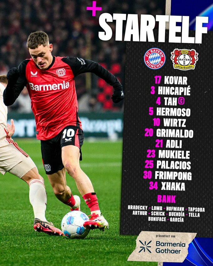 «Баєр»: Коварж, Мукіеле, Та, Інкапіе, Ермосо, Фрімпонг, Джака, Паласіос, Грімальдо, Віртц, Адлі.