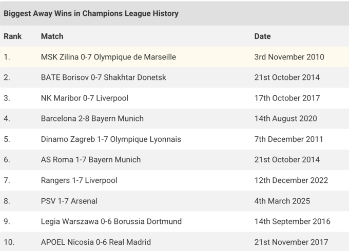 Рейтинг найбільших перемог в історії Ліги чемпіонів (на виїзді)