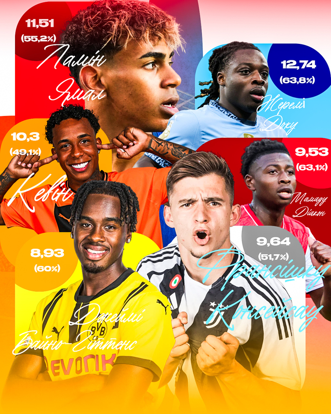 Хоча, безумовно, тактично-турнірні аспекти для кожної з команд також не можуть не впливати на показники гравців. Наприклад, у Лізі чемпіонів Франсішку Консейсау має аж другий найкращий показник (10,85 обведень за 90 хвилин) у сезоні-2024/25 (першість тут тримає Савіньо з «Манчестер Сіті» – 12,95), а ось у представлених вище його конкурентів місця значно скромніші: у Байно-Гіттенса – тринадцяте (7,69), у Ямала – п'ятнадцяте (7,33), у Кевіна – двадцять друге (6,35), Доку навіть не входить до топ-30, а Діакон банально не грав у цьому турнірі, так як «Реймс» поки що вкрай далекий від того, аби брати участь у найсильнішому європейському клубному змаганні.