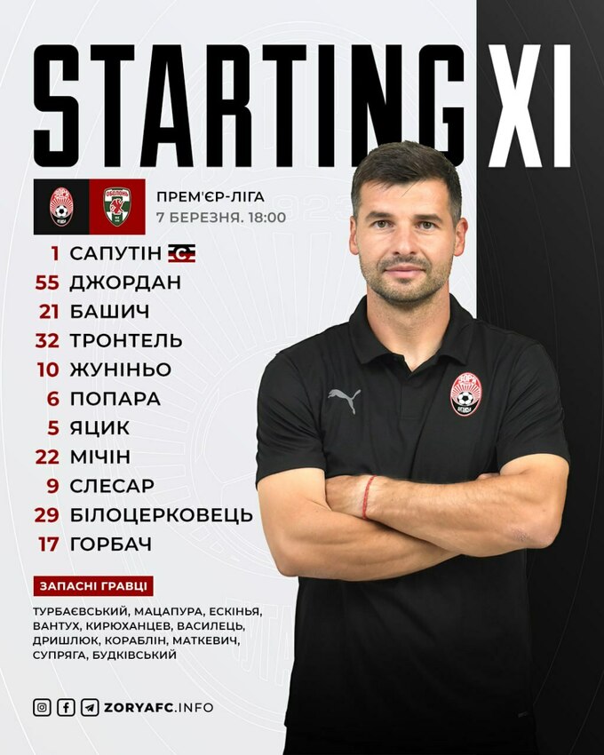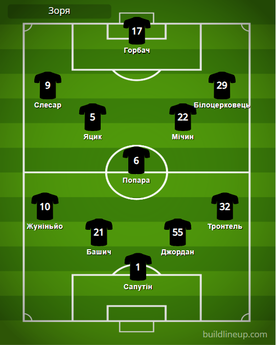 «Зоря»: Сапутін – Жуніньйо, Башич, Джордан, Тронтель – Яцик, Попара, Мічин (Дришлюк, 89) – Слесар (Василець, 67), Горбач (Будківський, 67), Білоцерковець (Супряга, 90+1).