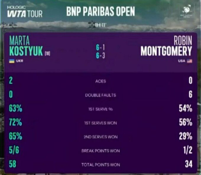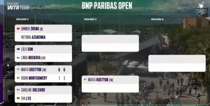 Українська тенісистка Марта Костюк (WTA 24) вийшла до 3-го раунду хардового турніру WTA 1000 в Індіан-Веллс, США.
