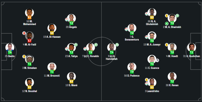 Український голкіпер «Аль-Шабаба» Георгій Бущан провів на полі весь матч, пропустив 2 голи, зробив 4 сейви. Статистичний портал SofaScore оцінив гру українця в 7.1 бала. Найкращим гравцем матчу визнано захисника гостей Мохамеда Аль-Швірейха, на рахунку якого 1 забитий м'яч і оцінка 7.9.