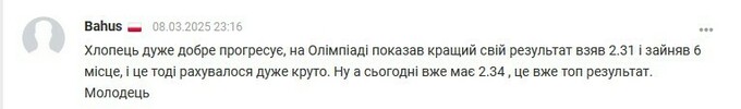 Bahus: Хлопець дуже добре прогресує, на Олімпіаді показав кращий свій результат взяв 2.31 і зайняв 6 місце, і це тоді рахувалося дуже круто. Ну а сьогодні вже має 2.34 , це вже топ результат. Молодець.