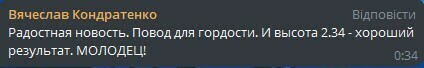 Вячеслав Кондратенко: Радісна новина. Привід гордості. І висота 2.34 – добрий результат. МОЛОДЕЦЬ!
