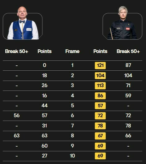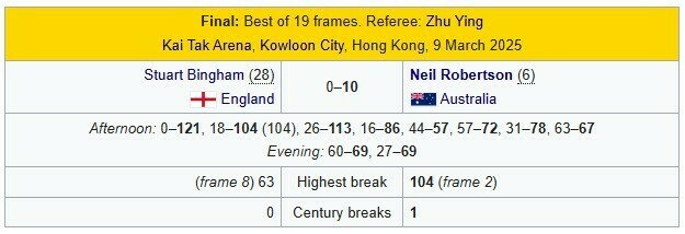 - Стюарт Бінгем (Англія) – Ніл Робертсон (Австралія) – 0:10