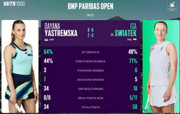 Це була третя зустріч суперниць. Іга виграла друге очне протистояння. Три тижні тому Даяна поступилася польці в 1/8 фіналу тисячника в Дубаї з рахунком 5:7, 0:6.