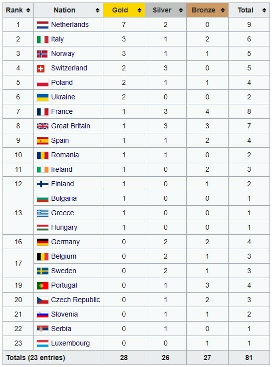 До топ-5 медального заліку увійшли: Нідерланди (7–2–0), Італія (3–1–2), Норвегія (3–1–1), Швейцарія (2–3–0), Польща (2–1–1).