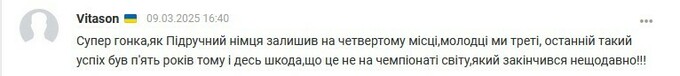 Vitason: Супер гонка,як Підручний німця залишив на четвертому місці,молодці ми треті, останній такий успіх був п'ять років тому і десь шкода,що це не на чемпіонаті світу,який закінчився нещодавно!!!