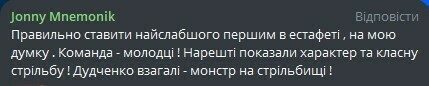 Jonny Mnemonsk: Правильно ставити найслабшого першим в естафеті , на мою думку. Команда – молодці ! Нарешті показали характер та класну стрільбу ! Дудченко взагалі – монстр на стрільбищі!