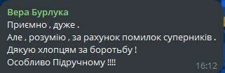 Вера Бурлука: Приємно, дуже. Але, розумію, за рахунок помилок суперників. Дякую хлопцям за боротьбу! Особливо Підручному!!!!