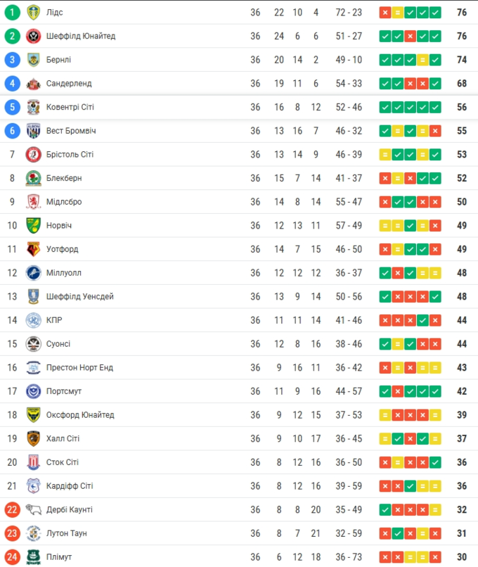 Помилкою Лідса скористалися і Бернлі (74 очки), і Сандерленд (68) з Ковентрі (56).