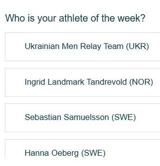 Номінантами минулого тижня стали: українська чоловіча естафета, Інгрід Ландмарк Тандреволд, Себастьян Самуельссон та Ханна Еберг.