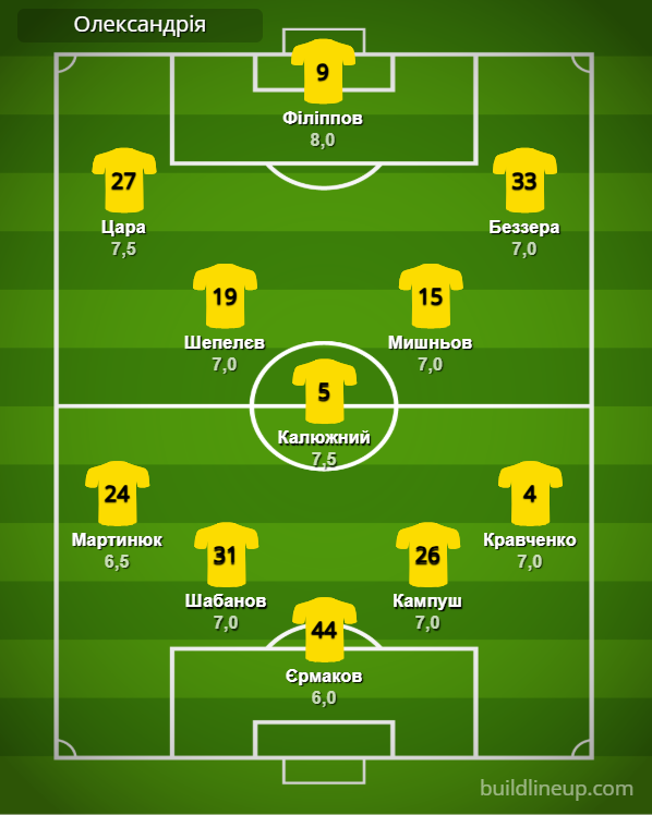 «Олександрія»: Єрмаков – Мартинюк, Шабанов, Кампуш, Кравченко – Шепелєв (Бєляєв, 75), Калюжний (Ващенко, 64), Мишньов (Матеус, 64) – Цара (Ндіка, 64), Філіппов (Кулаков, 75), Безерра.