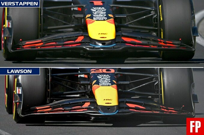Також команда провела порівняльні тести двох варіантів носового обтічника: Макс Ферстаппен працював із короткою версією, тоді як Ліам Лоусон випробовував довший варіант. Це може свідчити про аналіз впливу форми носа на аеродинамічну ефективність і баланс машини.
