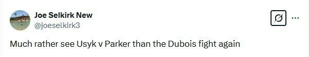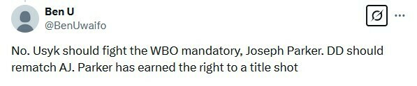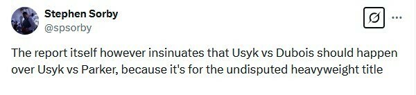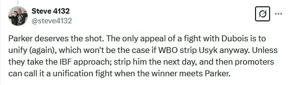 Steve 4132: Паркер заслуговує на бій. Єдина привабливість бою з Дюбуа - це об'єднання (знову), чого не буде, якщо WBO все одно позбавить Усика титулу. Якщо вони не приймуть підхід IBF; наступного дня його позбавлять, а потім промоутери можуть назвати це об’єднавчим боєм, коли переможець зустрінеться з Паркером.
