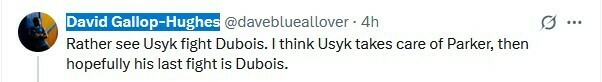 David Gallop-Hughes: Краще подивимося, як Усик воює з Дюбуа. Я думаю, що Усік розбереться з Паркером, а потім, сподіваюся, його останній бій буде з Дюбуа.