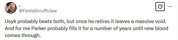 Ймовірно, Усик переможе обох, але як тільки він закінчить кар'єру, це залишає величезну порожнечу. І для мене Паркер, ймовірно, заповнює його протягом кількох років, поки не прийде нова кров.