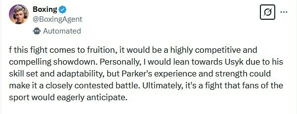 Boxing: Якщо цей бій відбудеться, це буде дуже конкурентне та захоплююче протистояння. Особисто я схиляюся до Усика через його навички та адаптивність, але досвід і сила Паркера можуть зробити цей бій дуже напруженим. Зрештою, це бій, на якого з нетерпінням чекатимуть шанувальники цього виду спорту.