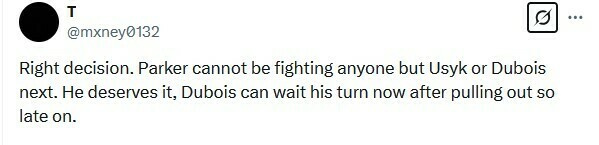 T: Правильне рішення. Паркер не може битися ні з ким, крім Усика чи Дюбуа. Він на це заслуговує, Дюбуа тепер може чекати своєї черги після того, як так пізно відмовився від участі.