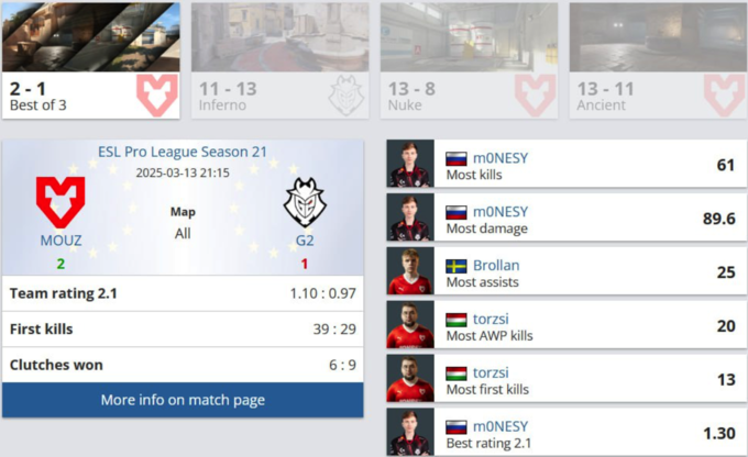 У другій половині ситуація загострилася, коли m0NESY та huNter- виграли важливі клачи 1v3 та 2v4, вивівши G2 вперед. Однак за рахунку 11:11 MOUZ змусили суперників ухвалювати складне рішення. Відчайдушний вихід на B у форсбай-раунді майже спрацював, але MOUZ зуміли вистояти і покарали G2 за ще одну невдалу економічну стратегію у фінальному раунді.