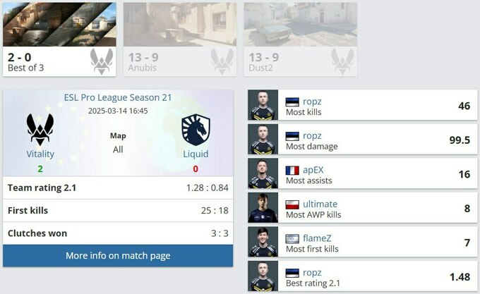 Vitality забезпечили собі місце в півфіналі ESL Pro League Season 21, здобувши перемогу 2:0 над Liquid. Ця серія стала дев'ятою поспіль для команди, причому за цей час вони програли лише дві мапи.