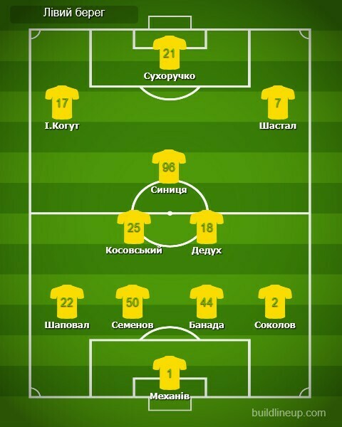 «Лівий Берег»: Механів – Шаповал, Якимів, Семенов, Соколов – Банада, Косовський (Приходько, 51) – І. Когут (Войцеховський, 46), Синиця (Дієго, 57), Шастал (Галас, 51) – Сухоручко.