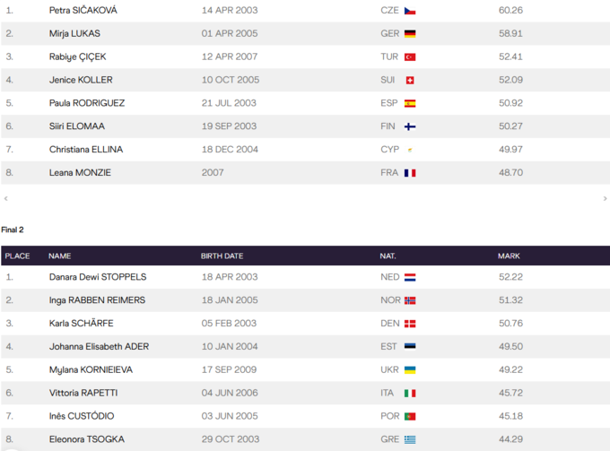 У метанні списа 15-річна Мілана Корнєєва завершила змагання з результатом 49,22 м, посівши 5 місце у групі В, 12 місце в заліку.