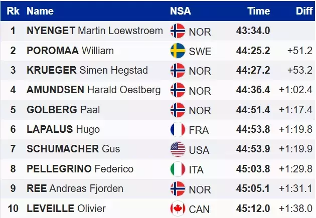 З величезним відривом у 51.2 секунди першим фінішував представник Норвегії Мартін Льовстрьом Ньєнгет. Для спортсмена ця перемога стала п'ятою в кар'єрі на Кубку світу.