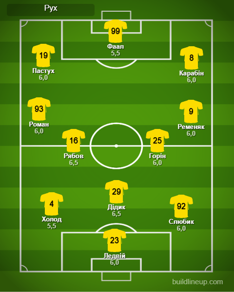 «Рух»: Ледвій – Холод, Дідик, Слюбик – Роман, Рябов, Горін (Підгурський, 57), Ременяк – Пастух (Погорілий, 84), Карабін (Алмазбеков, 75), Фаал (Притула, 57)