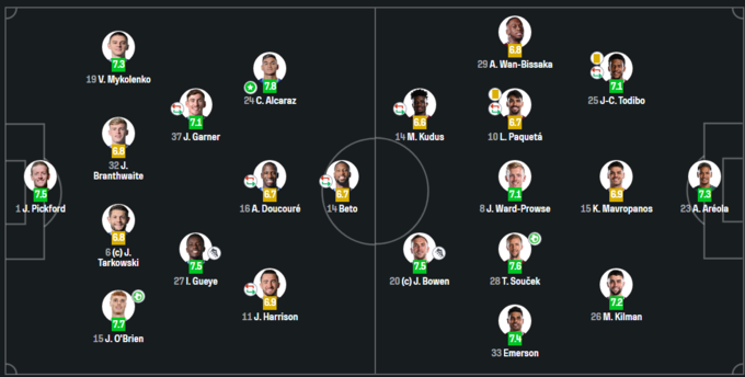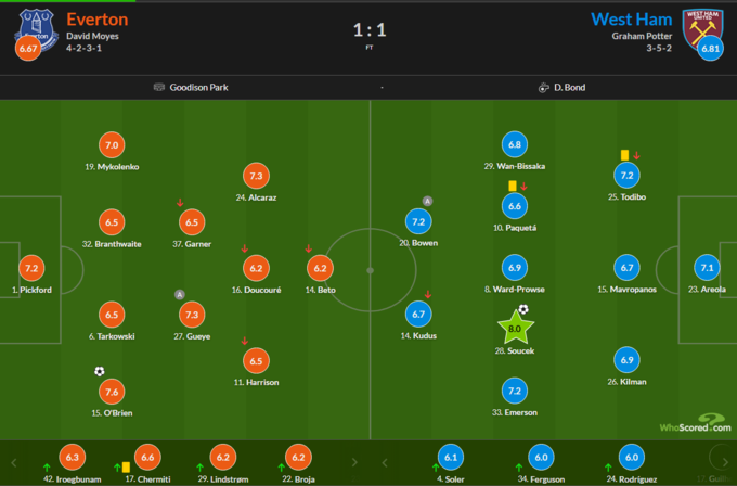 Український захисник «Евертона» Віталій Миколенко провів на полі весь матч, результативними діями не відзначився. Статистичний портал SofaScore оцінив його гру в 7.3 бала з 10 можливих, WhoScored дав Віталію оцінку в 7.0. Найкращим гравцем матчу за версією SofaScore став фулбек господарів Джейк О'Браєн, на рахунку якого 1 гол і оцінка 7.7. WhoScored виділив півзахисника «Вест Гема» Томаша Соучека. На його рахунку також 1 гол і оцінка 8.0.