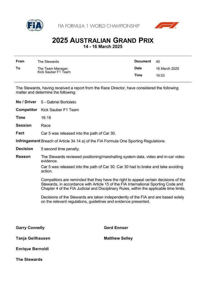 Пілот Заубер Габріел Бортолето отримав штраф у три позиції на старті Гран-прі Китаю. Таке рішення стюарди ухвалили через те, що бразилець не виконав 5-секундний штраф, за небезпечний виїзд з боксів під час гонки в Австралії. Згідно з регламентом, невиконання покарання у визначений термін переносить його наслідки на наступний етап у вигляді стартового штрафу.