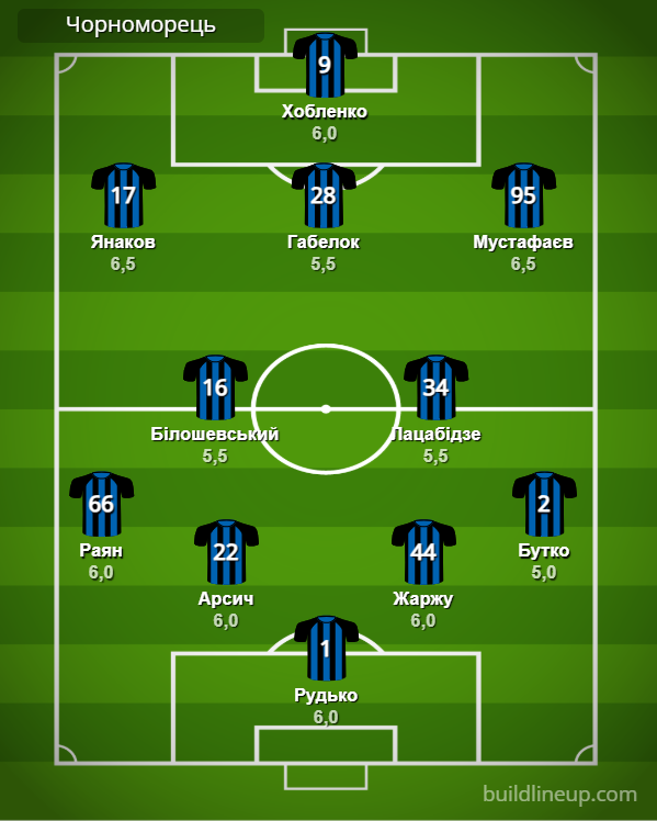 «Чорноморець»: Рудько – Раян, Арсич, Жаржу, Бутко (Безбородько, 73) – Білошевський, Лацабідзе (Шевцов, 46) – Янаков, Габелок (І. Когут, 46), Мустафаєв (Кисіль, 46) – Хобленко (Попов, 64).