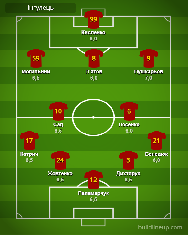«Інгулець»: Паламарчук – Катрич, Жовтенко, Дихтярук, Бенедюк (Дубілей, 88) – Сад (Фарасєєнко, 74), Лосенко – Могильний, П’ятов (Скороход, 90+4), Пушкарьов (Гаджук, 74) – Кисленко (Н. Попов, 88).