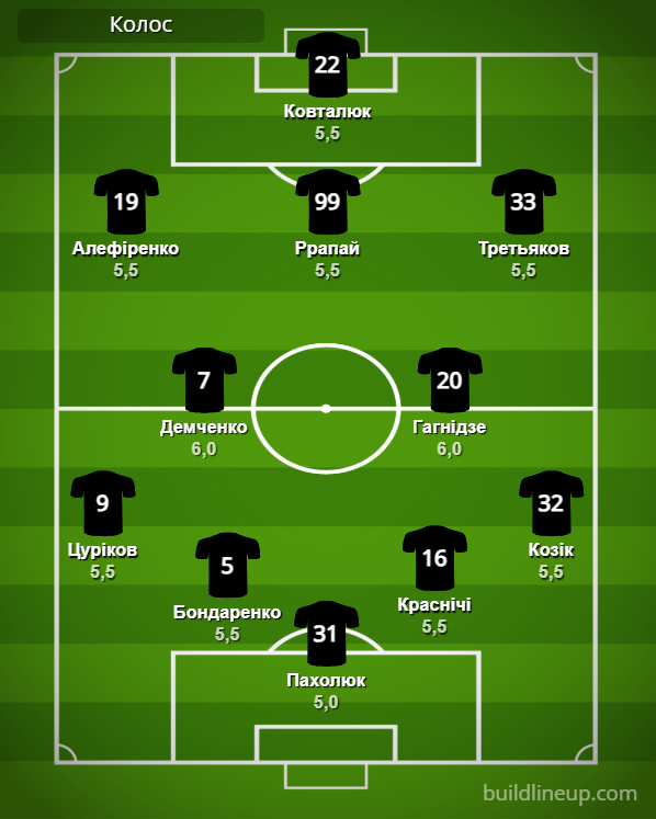 «Колос»: Пахолюк – Цуріков, Бондаренко, Краснічі, Козік – Демченко (Теллес, 73), Гагнідзе (Денисенко, 85) – Алефіренко (Велетень, 46), Ррапай, Третьяков – Ковталюк (Сидоров, 73).