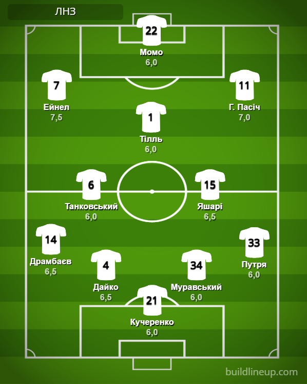 ЛНЗ: Кучеренко – Драмбаєв, Дайко, Муравський, Путря – Танковський (Нонікашвілі, 46), Тілль, Яшарі – Ейнел (Макуана, 87), Момо (Молло, 68), Г. Пасіч.