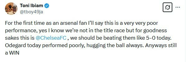 Toni Ibiam: Як фанат Арсенала я скажу, що це дуже поганий виступ, так, я знаю, що ми не в гонці за титул, але заради всього святого, це Челсі, ми повинні були сьогодні обіграти їх з рахунком 5-0. Едегор сьогодні виступив погано, постійно обіймаючи м'яч. У будь-якому випадку, все одно ПЕРЕМОГА.