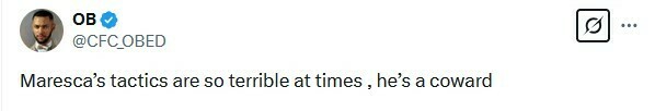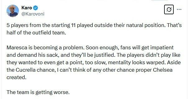 Karo: 5 гравців зі стартового складу 11 грали не на своїх звичайних позиціях. Це половина команди. Мареска стає проблемою. Незабаром уболівальники втратить терпіння і вимагатимуть його звільнення, і це буде виправдано. Гравці грали не так, як хотіли, щоб заробити бодай очко, надто повільно. Крім шансу Кукурельї, я не можу згадати жодного іншого шансу, який створив «Челсі». Команда стає все гірше.