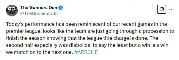 The Gunners Den: Сьогоднішня гра нагадує наші нещодавні ігри в Прем’єр-лізі, схоже, що команда просто збирається завершити сезон, знаючи, що боротьбу за титул чемпіона завершено. Особливо другий тайм був, м’яко кажучи, диявольським, але перемога – це перемога, яку ми порівнюємо з наступною.