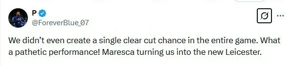 P: Ми навіть не створили жодного чіткого моменту за всю гру. Яка жалюгідна вистава! Мареска перетворює нас на новий Лестер.