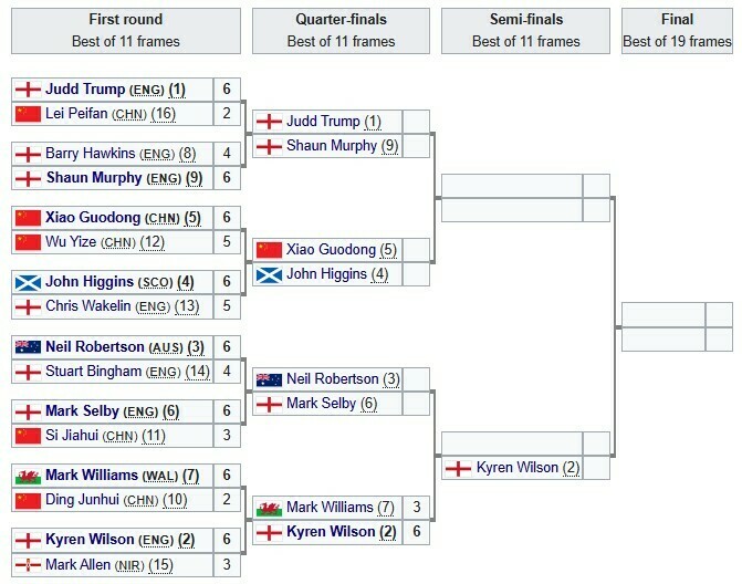 - Марк Вільямс (Уельс) – Кайрен Вілсон (Англія) – 3:6