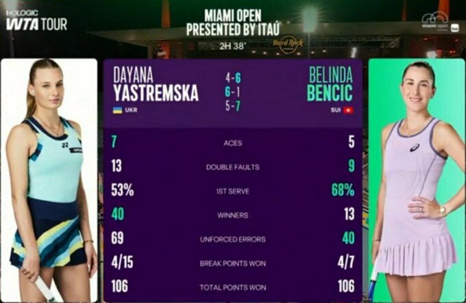 Українська тенісистка Даяна Ястремська (WTA 42) завершила виступи на престижному хардовому турнірі WTA 1000 у Маямі, США.