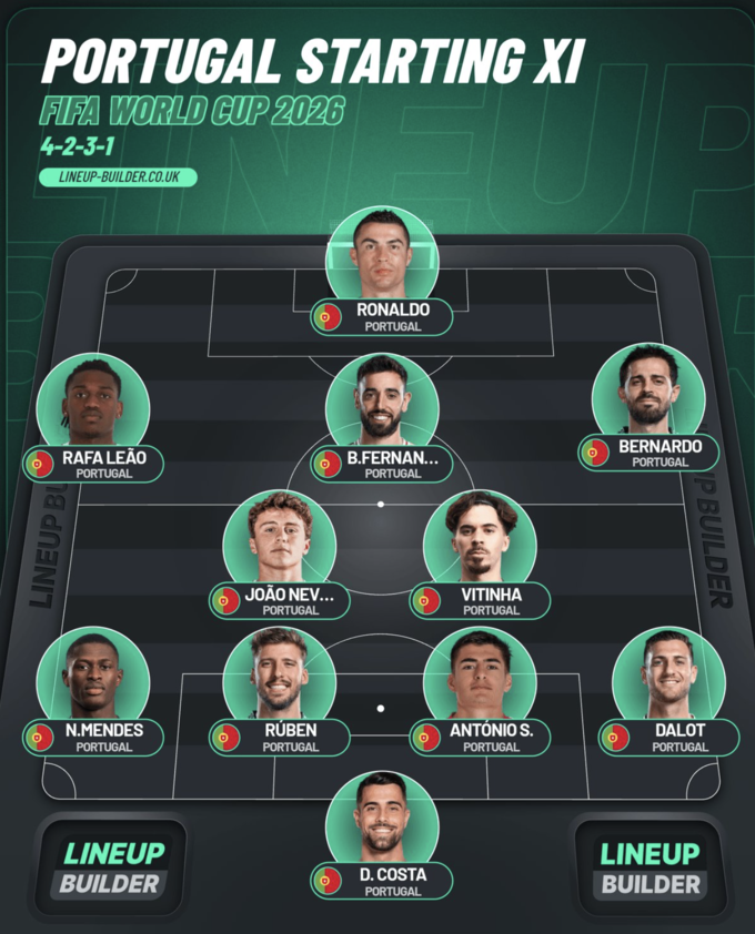 Португалія: Кошта, Далот, Вейга, Рубен Диаш, Мендеш, Витинья, Жоау Невеш, Бруну Фернандеш, Нету, Леау, Роналду