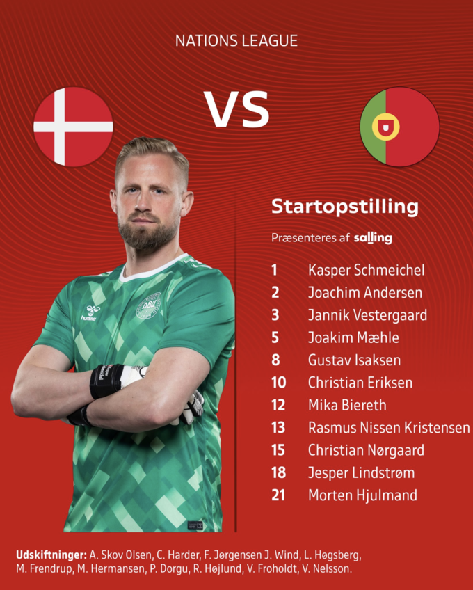 Данія: Шмейхель, Крістенсен, Вестергор, Андерсен, Ісаксен, Юльманн, Еріксен, Нергор, Мегле, Бірет, Ліндстрем