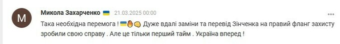 Микола Захарченко: Така необхідна перемога! Дуже вдалі заміни та перевід Зінченка на правий фланг захисту зробили свою справу. Але це тільки перший тайм. Україна вперед!