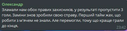 Олександр: Зламали нам обох правих захисників, у результаті пропустили 3 голи. Заміни знов зробили свою справу. Перший тайм жах, що робити з м'ячем не знали. Але перемогли, тому що краще грали до кінця.